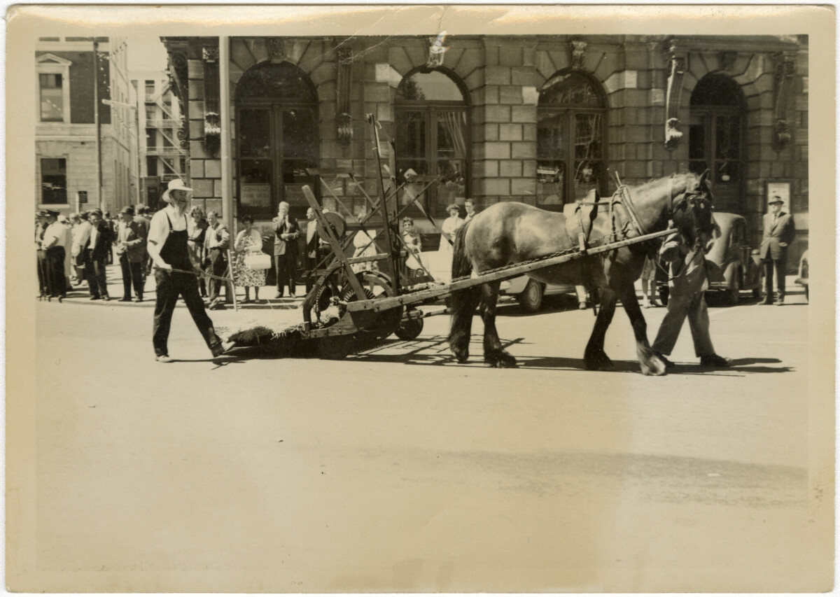 Canterbury A&P Centennial. Horse pulling farm equipment in Cathedral Square.