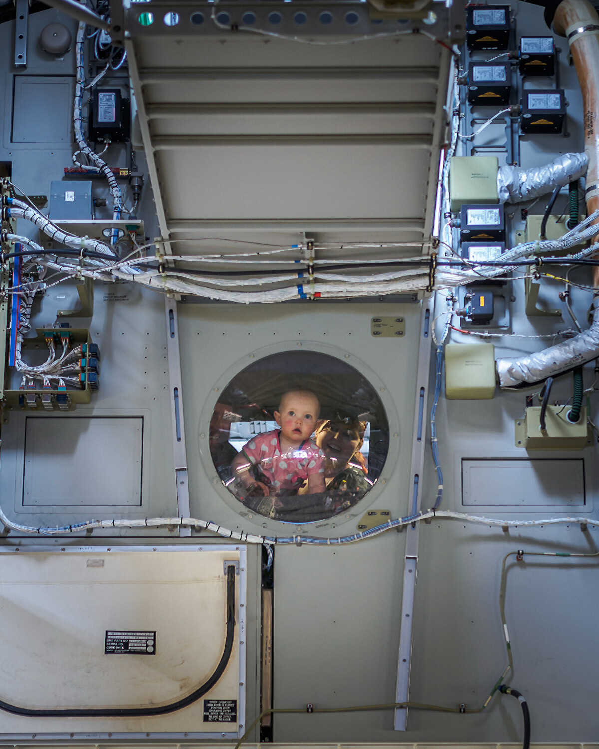 An infant looks out through an observation window over the cargo bay inside a C-17 Globemaster III at the United States Antarctic Programme Open Day at Christchurch Airport.