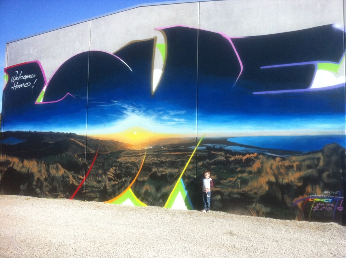 Connor Cogle standing in front of the Welcome Home: LOVE mural by Richard 'Pops' Baker. Painted in 2016. 136 Stanley Street. Sydenham.