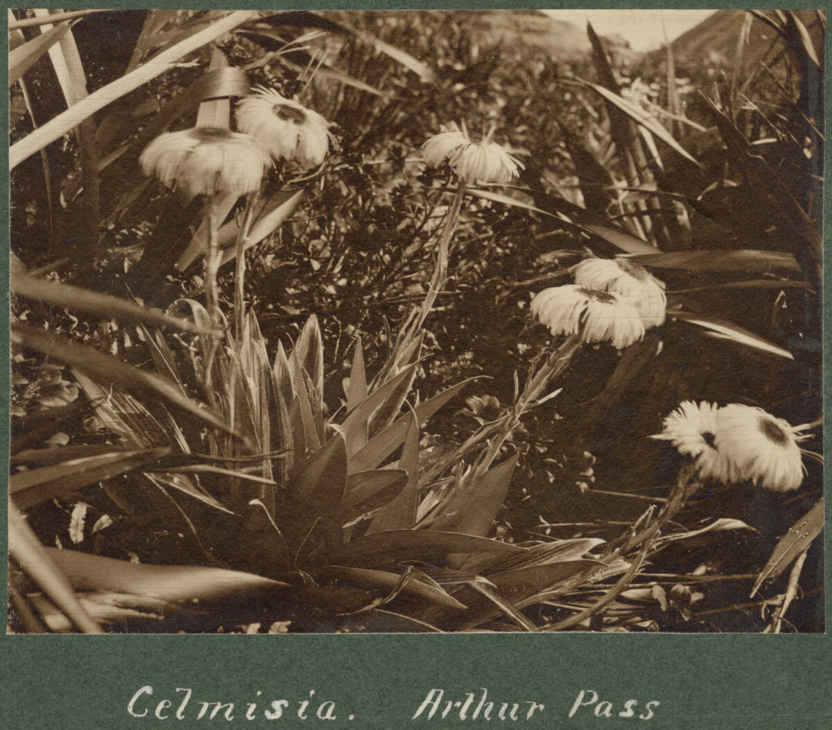 Celmisa growing at Arthurs Pass. Taken by Frederick Charles Brockett when on a bicycle trip with friends From Christchurch over Arthurs Pass to Greymouth.