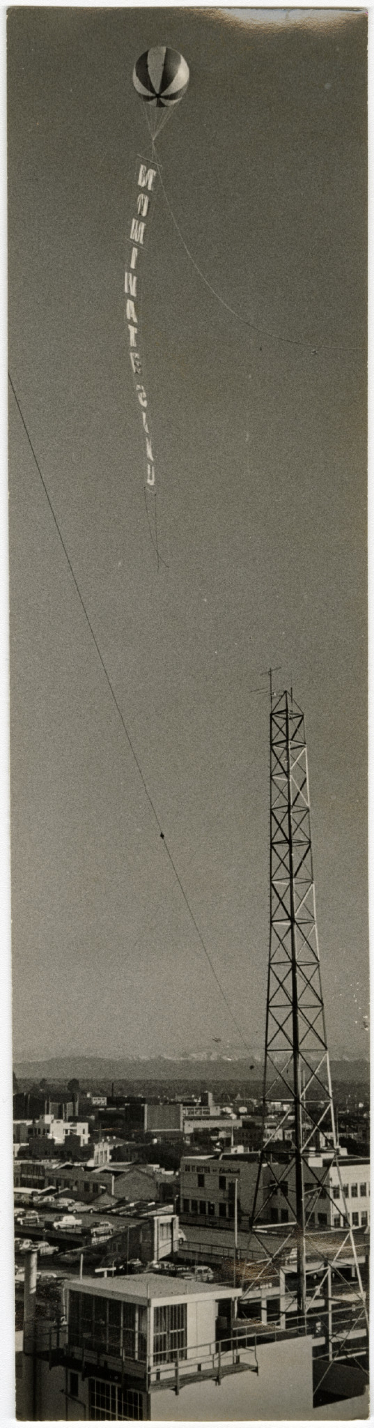 Advertising balloon for SIMU Insurance Company suspended over a radio tower. Taken looking North East across the city from Gloucester Street.