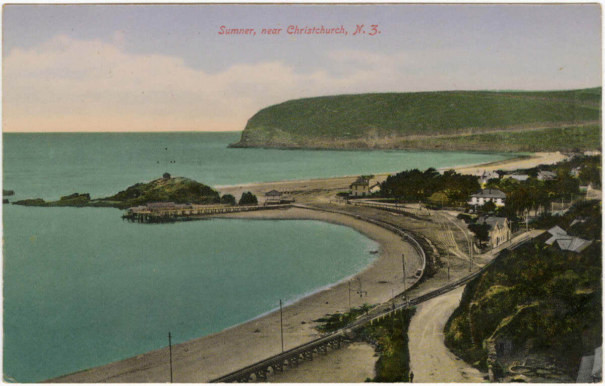 Tea rooms from Sumner beach. Groups of people are on the beach ...