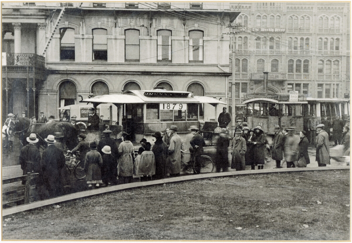Am guessing this is post World War 1. Grandfather driving horse drawn tram in Cathedral Square. (John Stewart - lived in Perr Street, Riccarton). A steam driven tram is in the background. Outside Warners Hotel. The Press building behind.