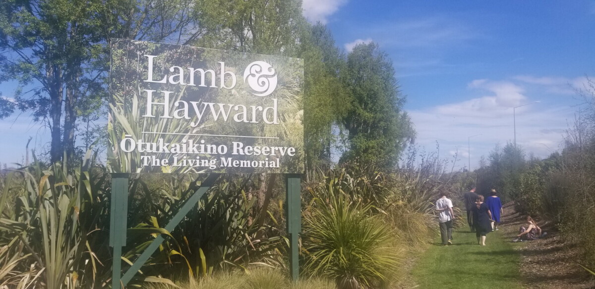 An extended whanau group walking through Otukaikino Reserve on the fifth anniversary of the death of a loved one. A tree was planted in Otukaikino Reserve to celebrate the deceased loved one's life not long after his passing in 2014.
