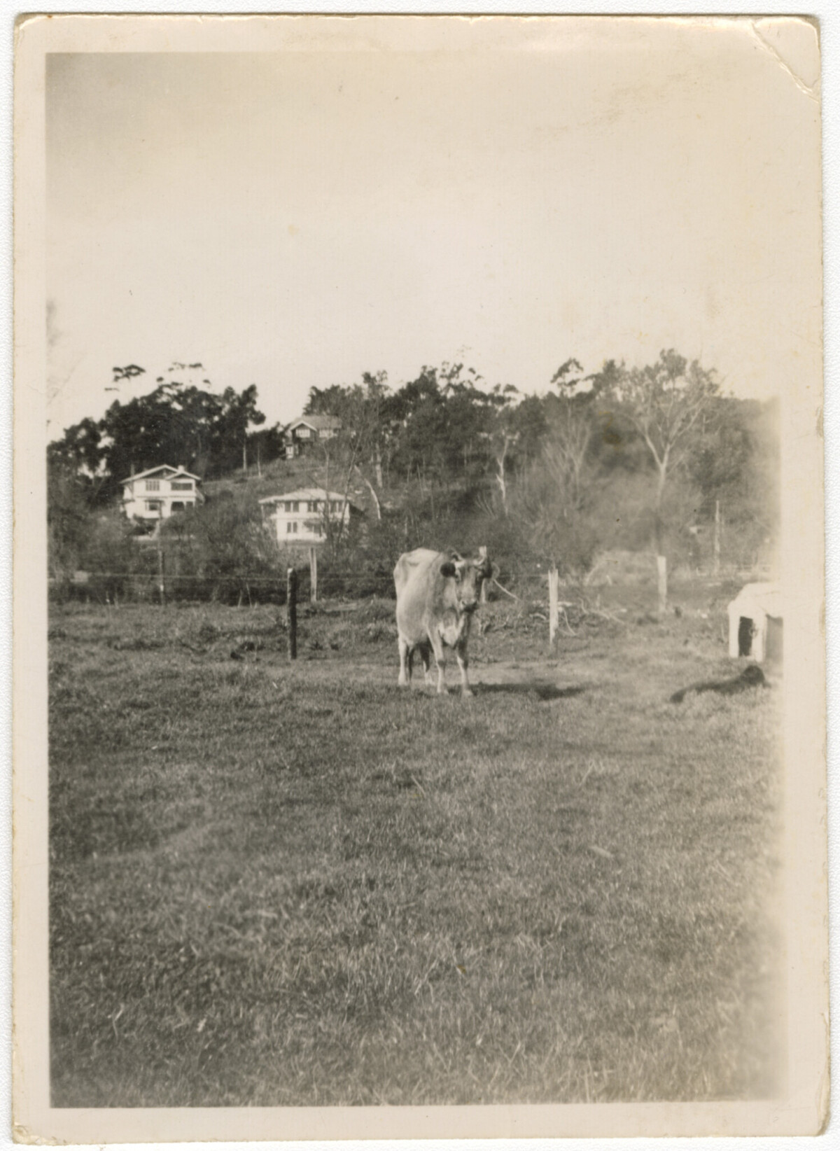"House cow, Butler Street Opawa. The area now is taken up with housing. Butler Street finished at no. 11 (now 21) and there was a gate at that point, grazing for cows from there. It was used for horse grazing from around 1950. This view is looking towards houses on Murray Aynsley Hill. My Grandmother used the cows milk and made butter for home use." - Contributor's note