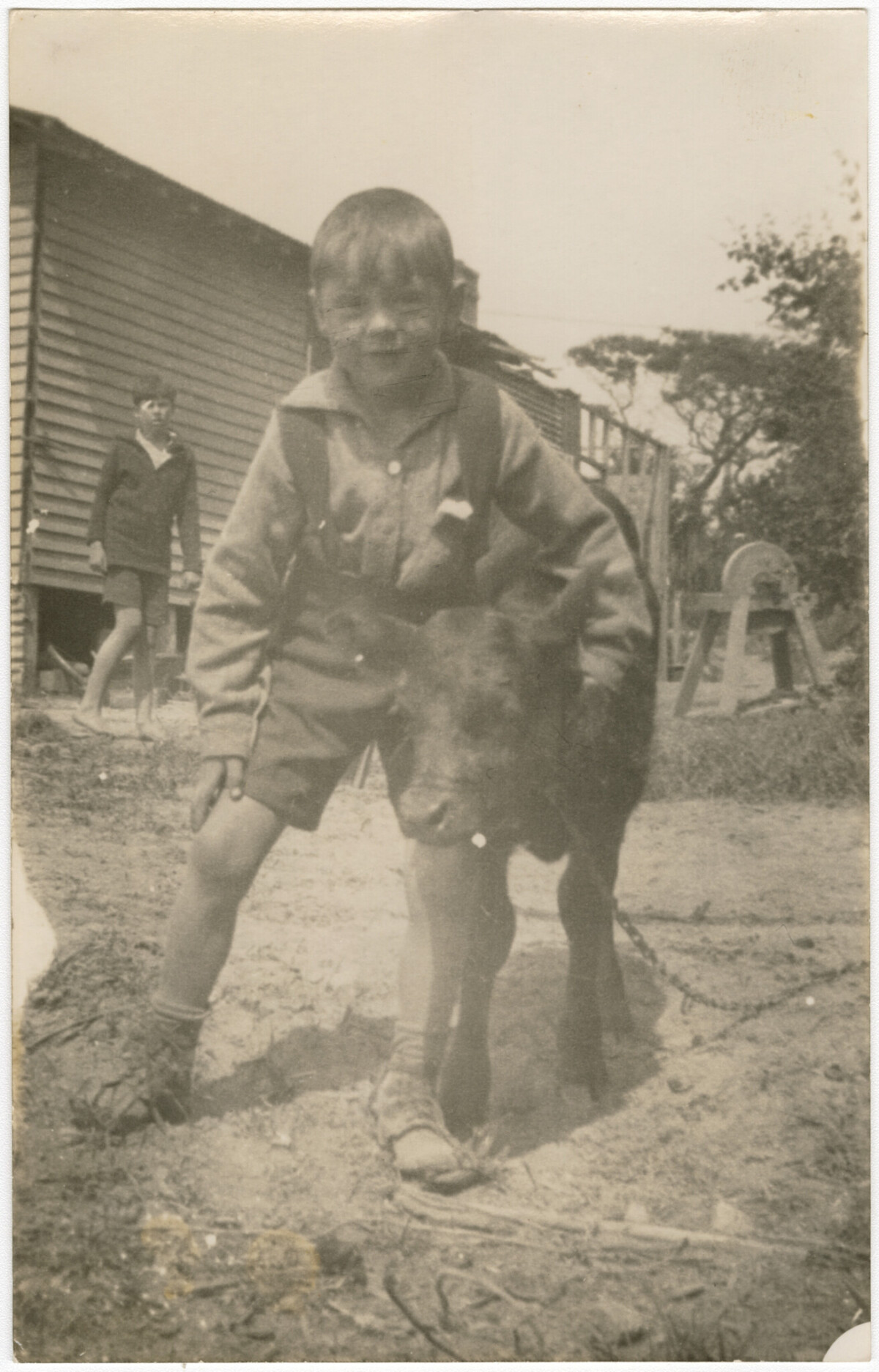 "Arthur Sutton with a young calf born to the "house cow" at the family home in Butler Street, Opawa. The saw in the background was used by Arthur's father Bertie who was a carpenter and cabinet maker." - Contributor's note