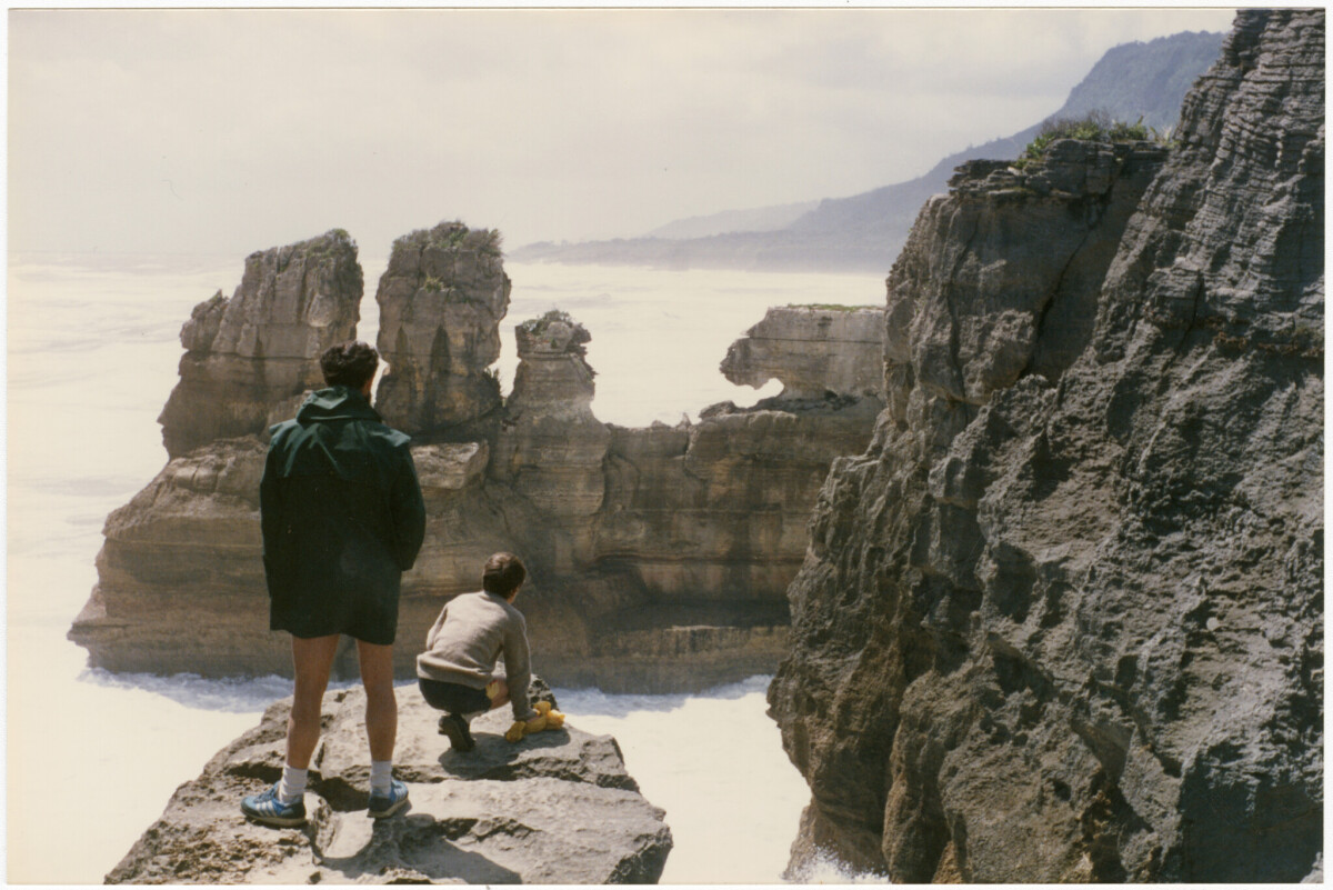 "Before the barriers. Stuart and Roland Payne on the Pancake rocks at Punakaiki. Before the days of safety rails and barriers you could walk right out to the edge." - Contributor's note