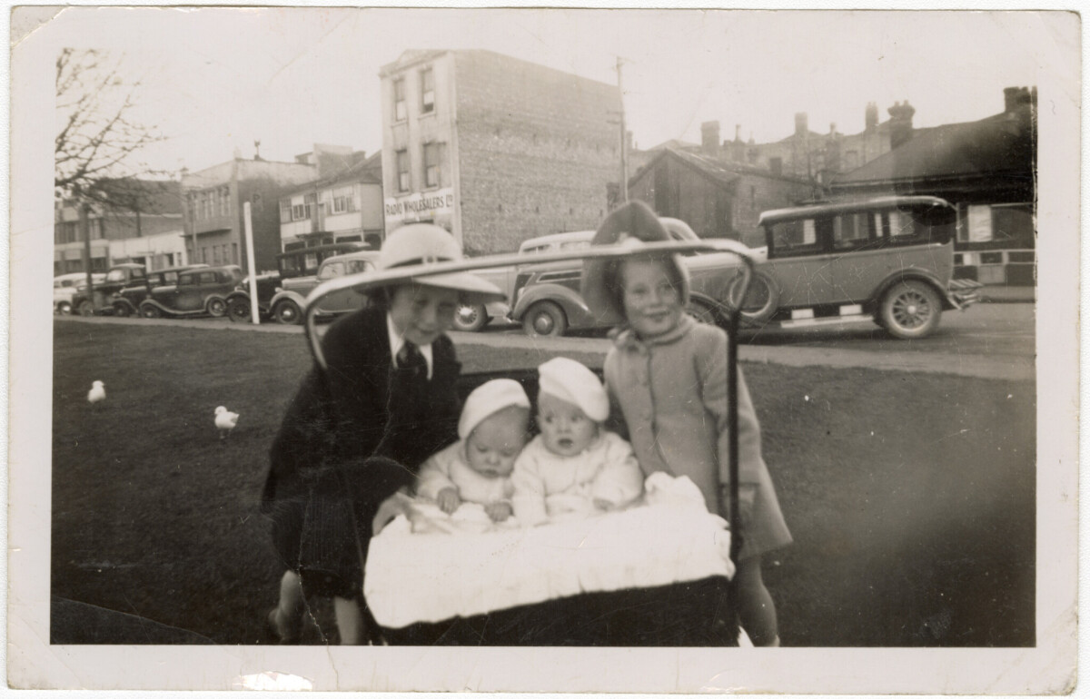 "This photo was taken alongside the Oxford Terrace Plunket rooms. Avon River on the left. The twin boys have been wheeled in their Double Brougham Blue pram to the regular Plunket nurse check up from 358 Tuam Street. The two sisters are flanked on either side. Left: Sheryn has just started St Joseph's Cathedral School, in her brown uniform. Fidelma is dressed in pink attended the Phillipstown Kindergarten." - Contributor's note