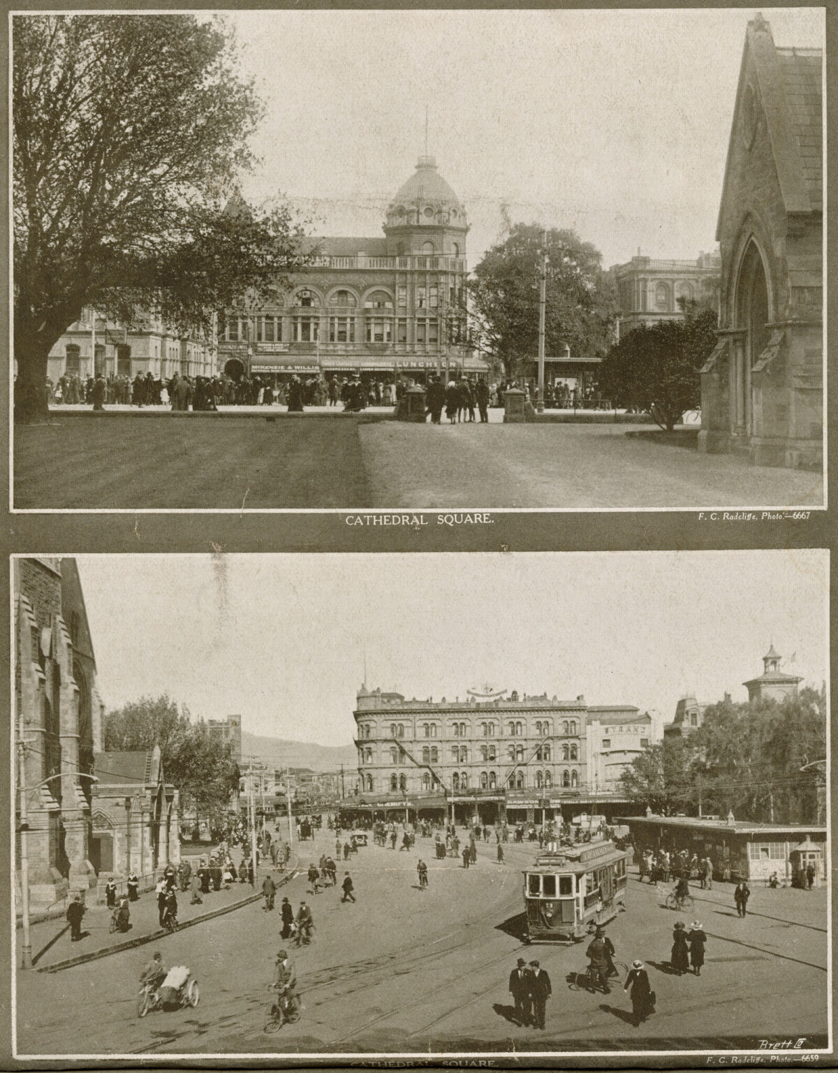 1 o 24 photos by FG Radcliffe in a booklet titled "Scenes from Christchurch New Zealand's Garden City". Photo "Cathedral Square". FG. G. Radcliffe. Photo-6659