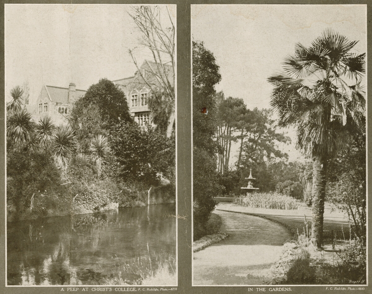 1 of 24 photos by FG Radcliffe in a booklet titled "Scenes from Christchurch New Zealand's Garden City". Photo "A Peep at Christ's College". FG. G. Radcliffe. Photo-6710