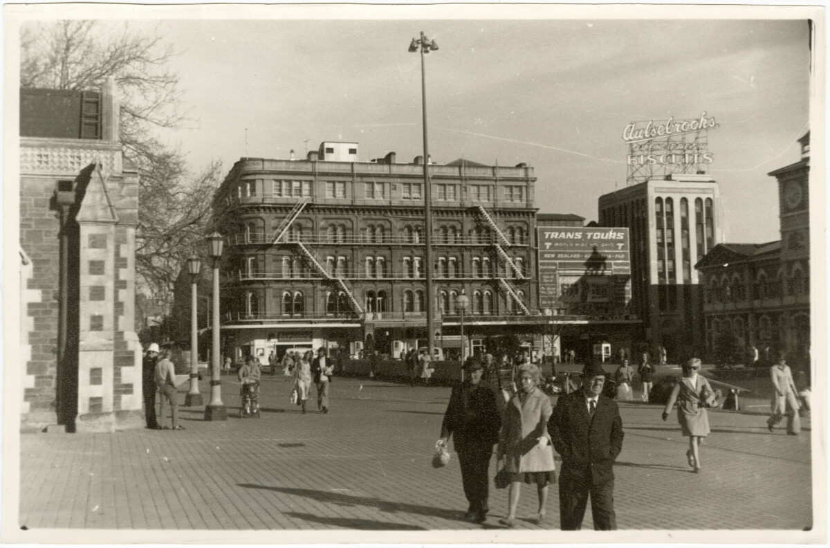 People walking in Cathedral Square looking towards Woodwards ...