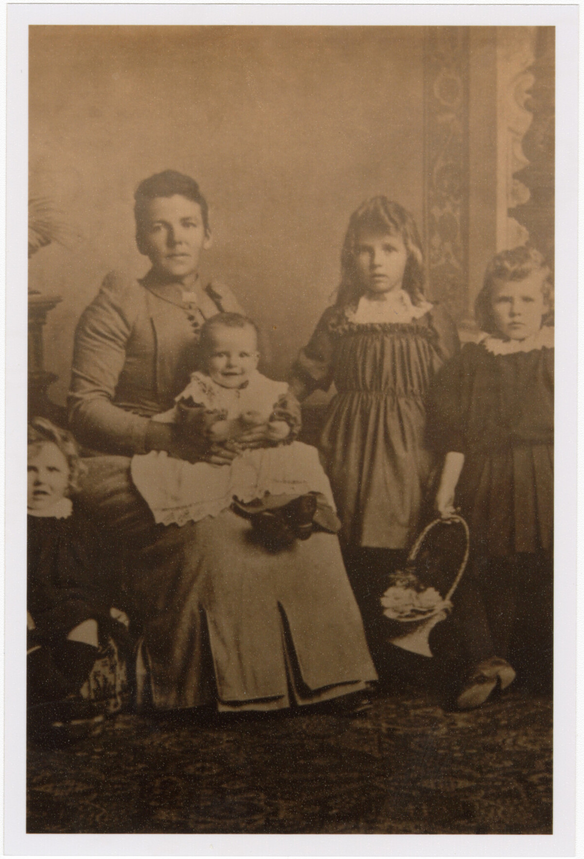 "This is a studio photo taken in Lyttelton. The girls are the first four female children born to Hannah and James Huston ( a boy is missing from the photo) Hannah Huston would be about 25 years old. The girls are: May born 1888 on Hannah's right. May never married. Standing holding a basket is Edith born 1889. Hilda, on Hannah's right born 1891 and Linda born 1895. Edith married William Neil Sergison. Hilda married P[e]ter Harkess a[n]d Linda married Syde Soughagy. Photography was in its infancy and to avoid blurring the children would have had to sit perfectly still." - Contributor's note