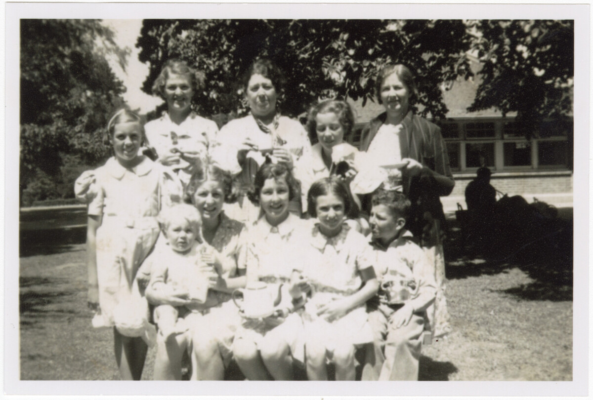 "Cousins at the Botanical gardens. Note there are only two boys in the photo. Rodney Cooper on the left and Perter Harkess. The woman back row middle is Edith Sergison and her sister Hilda Harkess is right on the end. These women were Hustons. The children are first cousins, Sergisons, Judge and Harkess. They took the Lyttelton train to Christchurch and then walked to the Gardens carrying all their food and drink. The Botanical gardens was well frequented by families. Peter fell into the Avon after this photo and his mother had no change of clothes for him." - Contributor's note