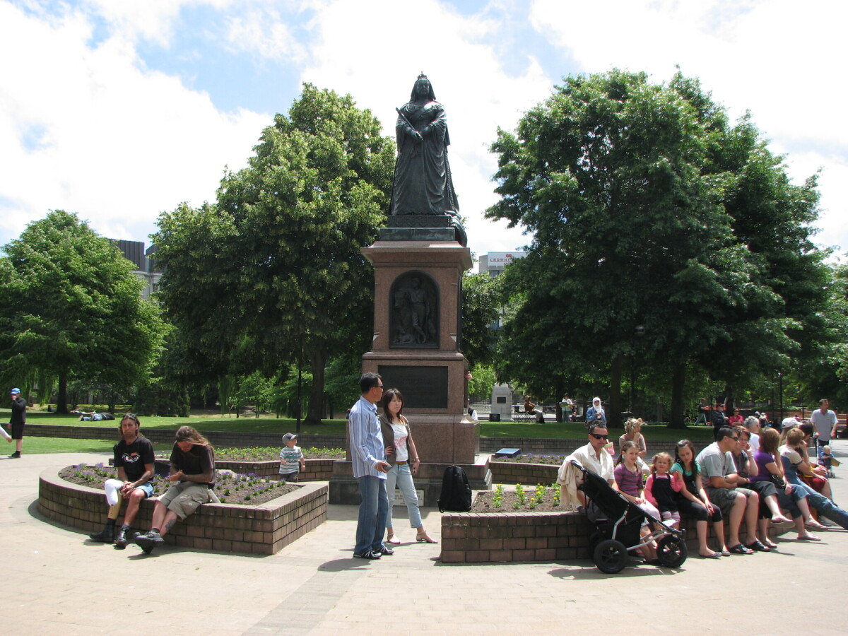People sitting by the statue of Queen Victoria in Victoria Square