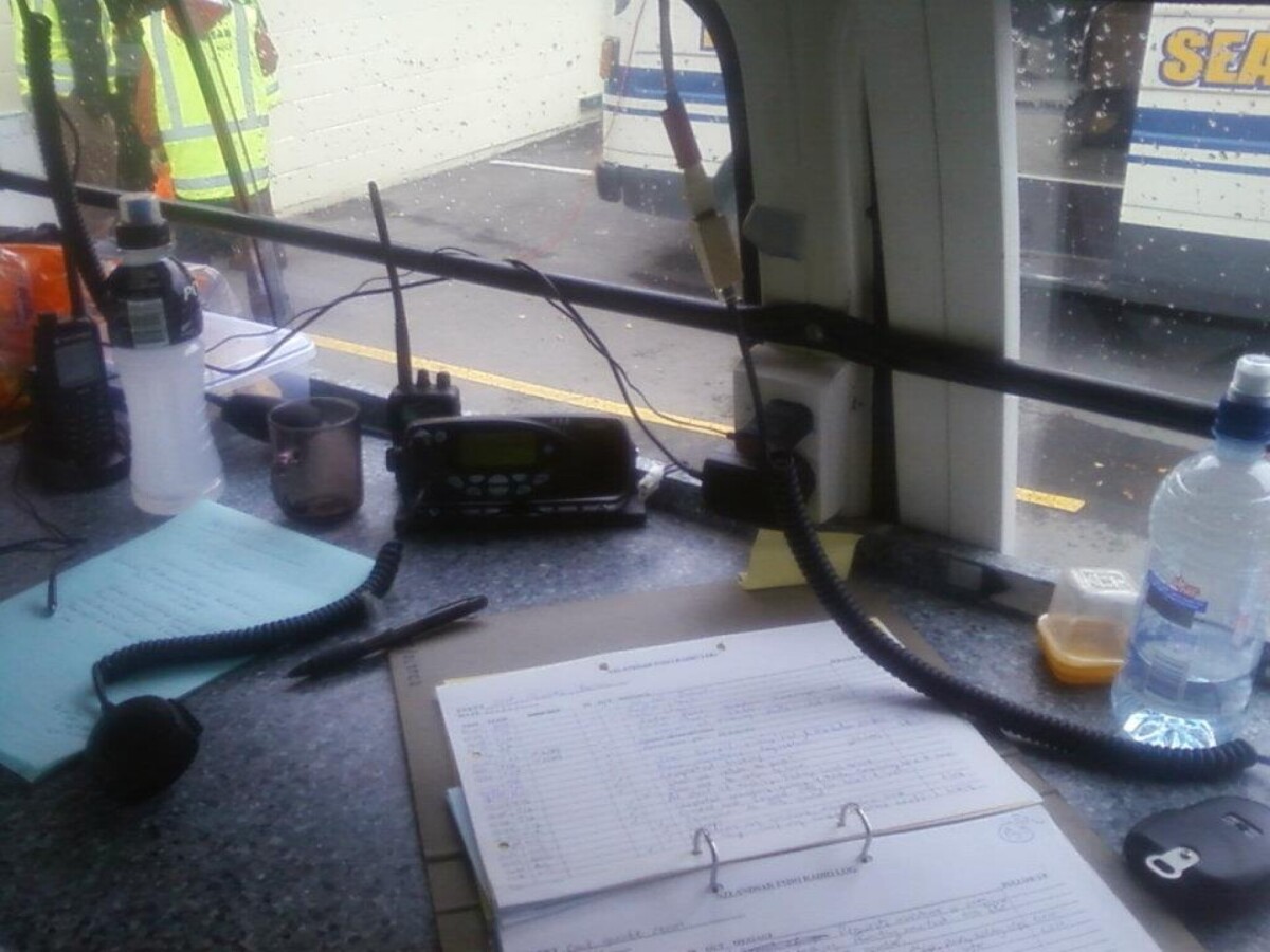 From 25 February 2011 for a period of nearly two weeks hundreds of emergency response volunteers ran "Operation West" - a welfare operation aiming to visit every household in western Christchurch to check on residents and gather information about the state of the city. In that time more than 70,000 households were visited by LandSAR staff supported by Amateur Radio Emergency Communications (AREC) providing radio communications. The operation was based at Halswell Domain. This photo shows one radio operating position in the comms bus where radio messages were exchanged across the city and logged.