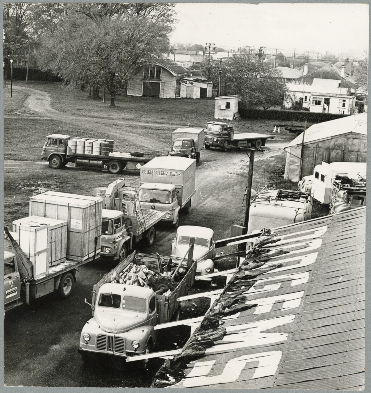 Carrying vehicles lined up outside Canterbury Court to transport freight during the railway workers' strike.