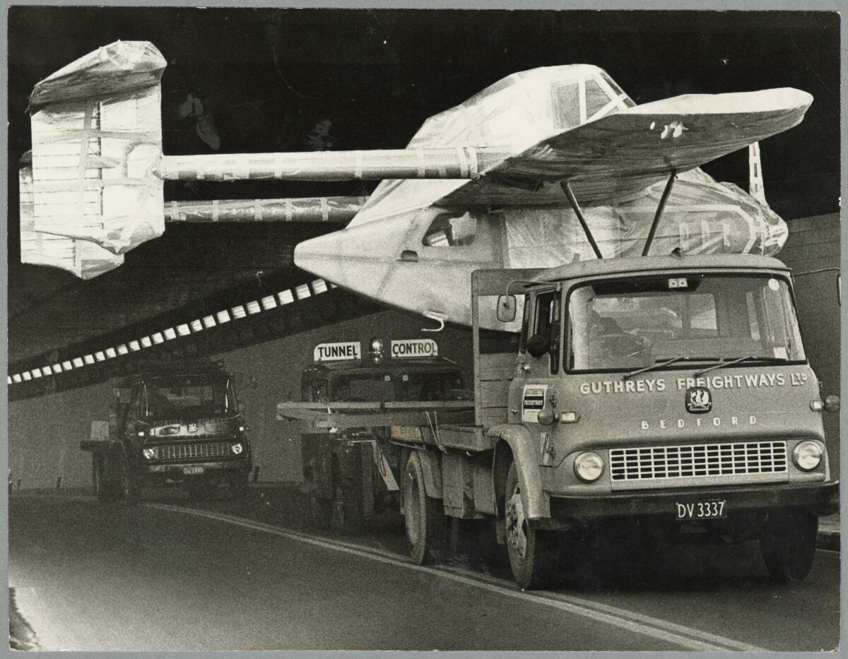 A Tranzauia 12 top dressing aircraft being carried on the back of a lorry through the Christchurch to Lyttelton tunnel.