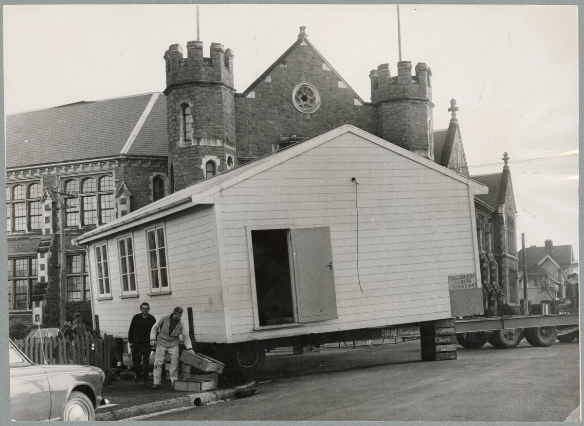 Jimmy Curline (front) and his brother Ronny Curline of J. B. Curline Ltd transporting a prefabricated building to the Teachers' Training College on Durham Street.