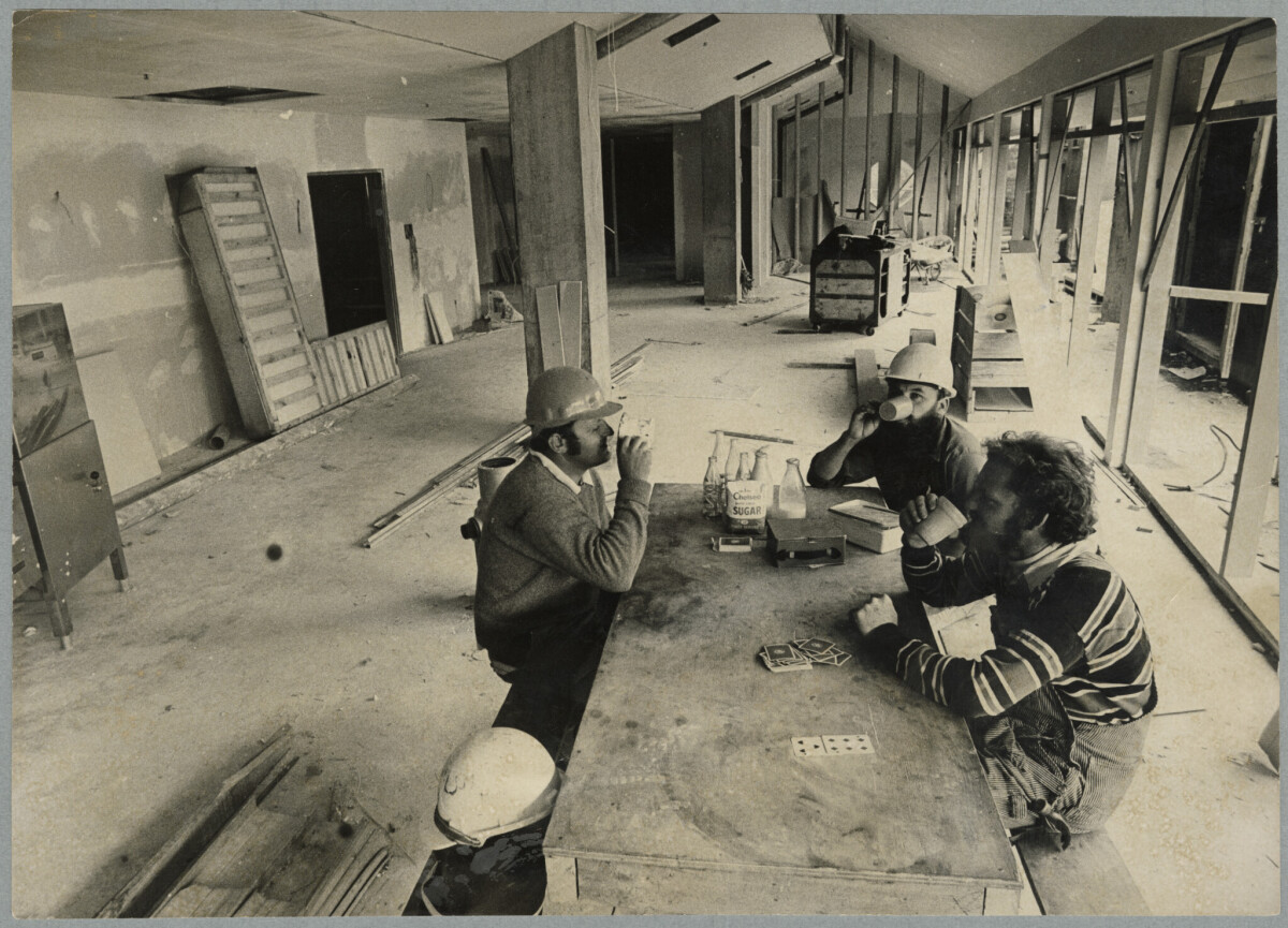 Contractors, George Thyme, Ivan Basargin and Gerald Woodside, take a break from construction in what will be the restaurant of the Ramada Inn hotel.
