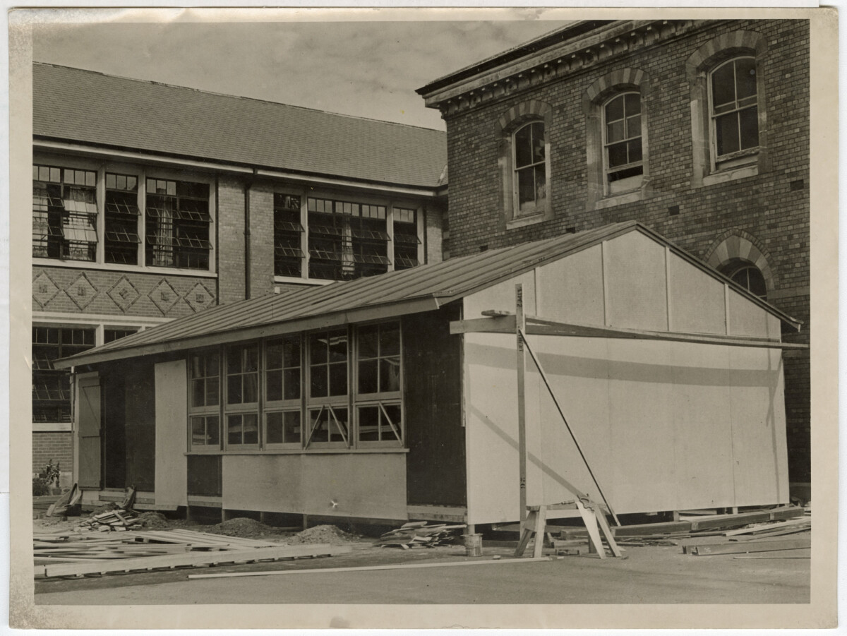 Exterior of prefabricated classrooms being constructed on the grounds of Christchurch West High School on Hagley Avenue to accommodate increasing numbers of pupils.