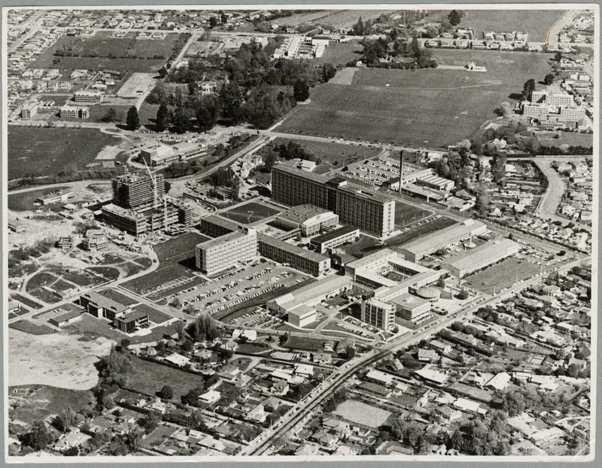 Aerial view showing the construction of the University of Canterbury campus at Ilam.