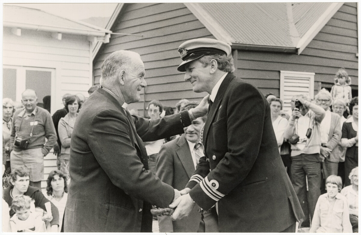 The Rev Poai Manahi greets Lieutenant Commander H. Dawson at the Okains Bay Waitangi Day celebrations.