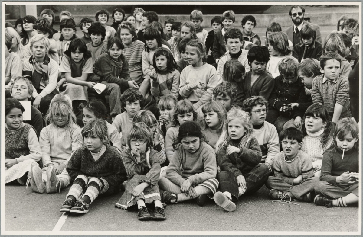 A group of Lyttelton school children sitting on the playground outside during the showing of a two-thirds sized copy of the flag on the Terra Nova, Captain Robert Falcon Scott's ship in 1910.