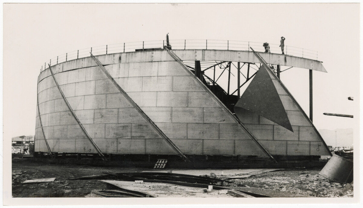 Demolition of gasholder at the Christchurch Gas Company gas works.