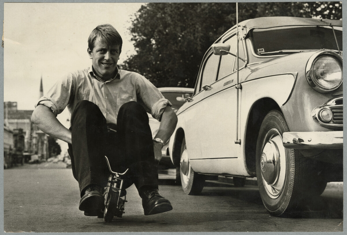 Stuart McLean riding his mini-mini-micro bike up Colombo Street past Victoria Square.