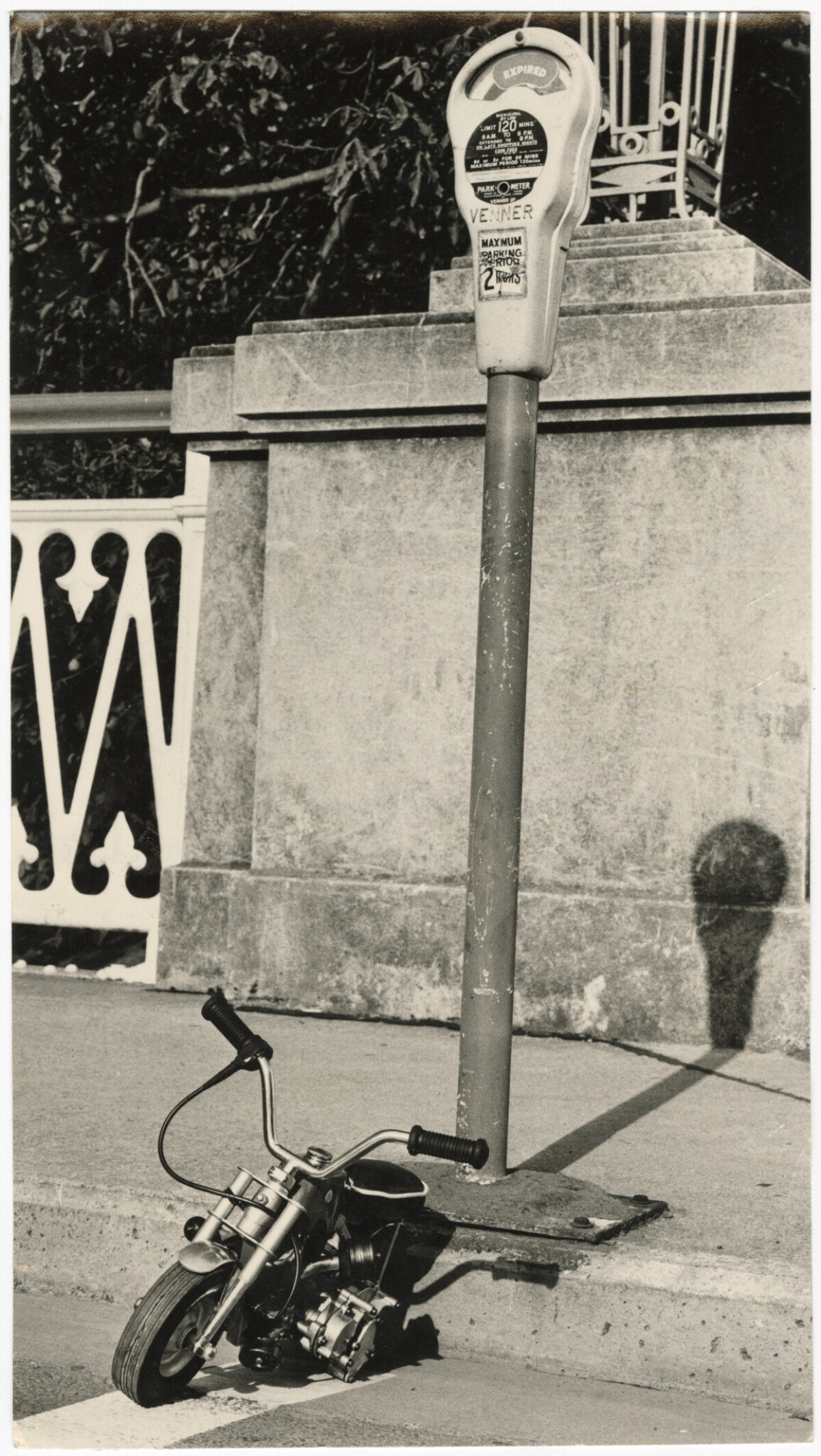 The mini-mini-micro bike of Stuart McLean beneath a parking meter.