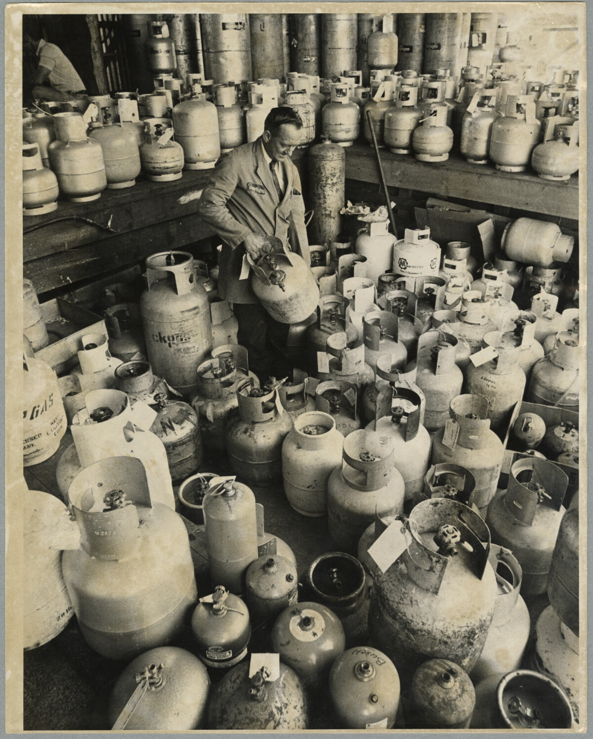 Rockgas attendant, Gordon Hooper, with gas canisters waiting to be filled at the Christchurch Gas Company's Waltham Street depot.