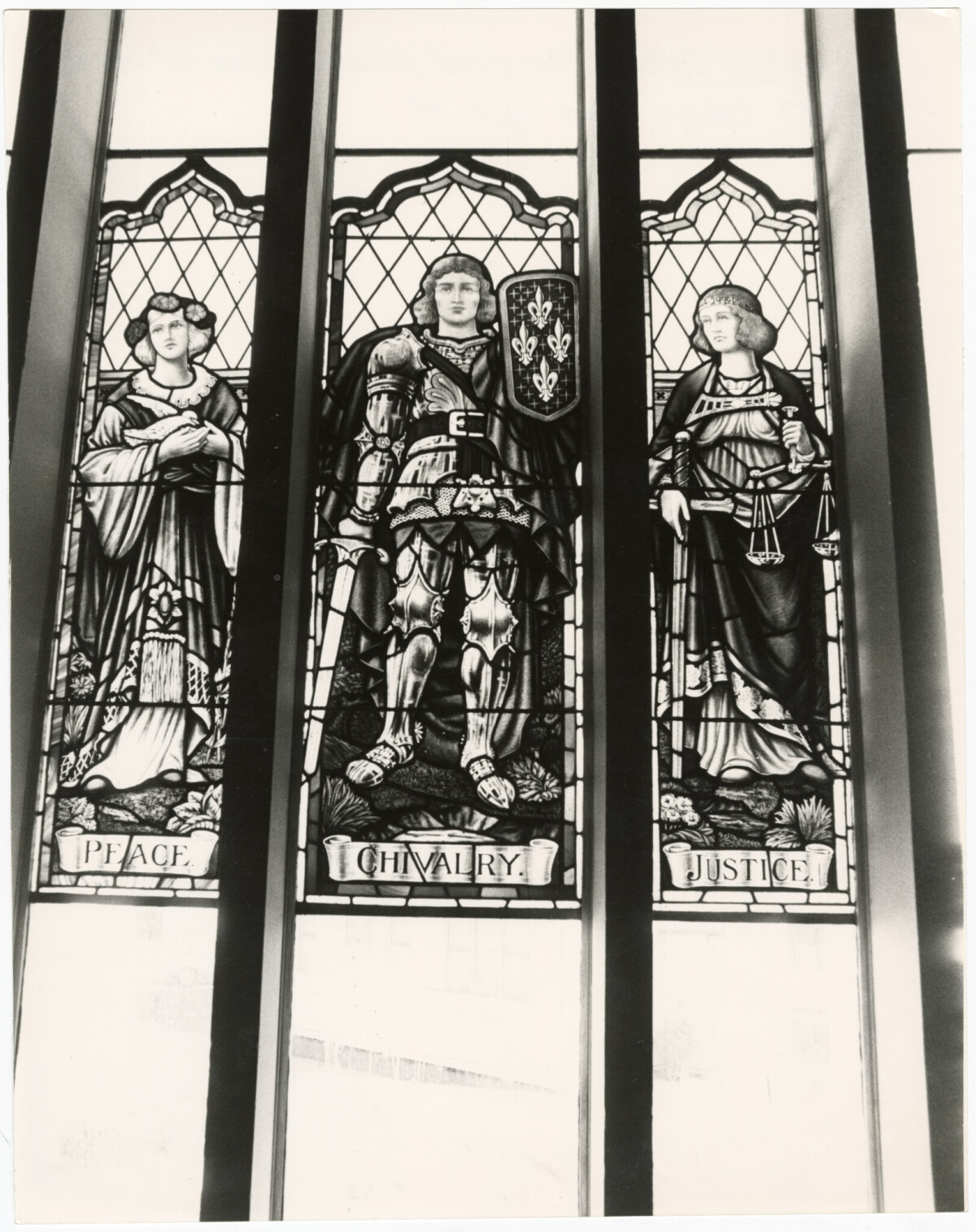 Close up of the Stained glass Teachers College memorial window shortly after it was moved to Ilam.