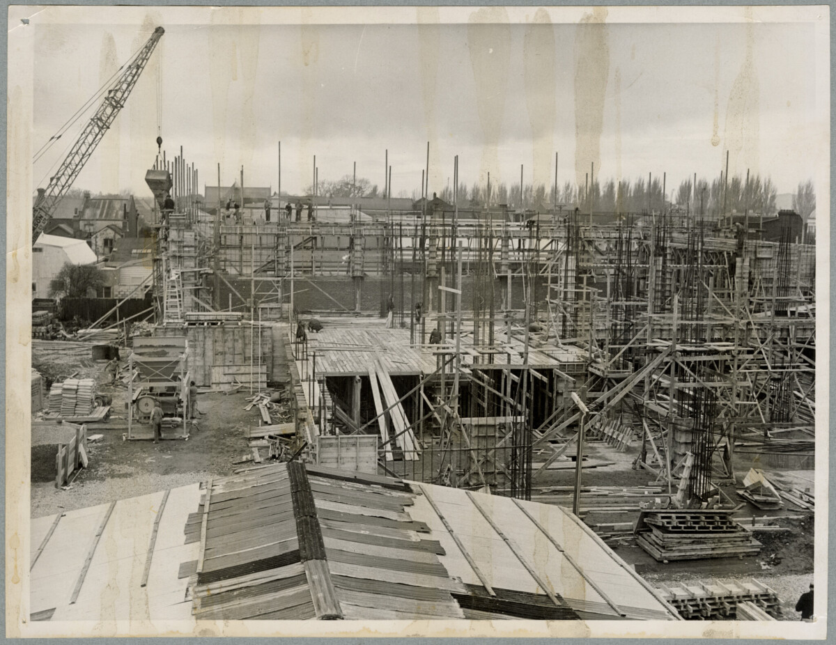 Scaffolding on the construction site of the Christchurch Star office building on Kilmore Street.