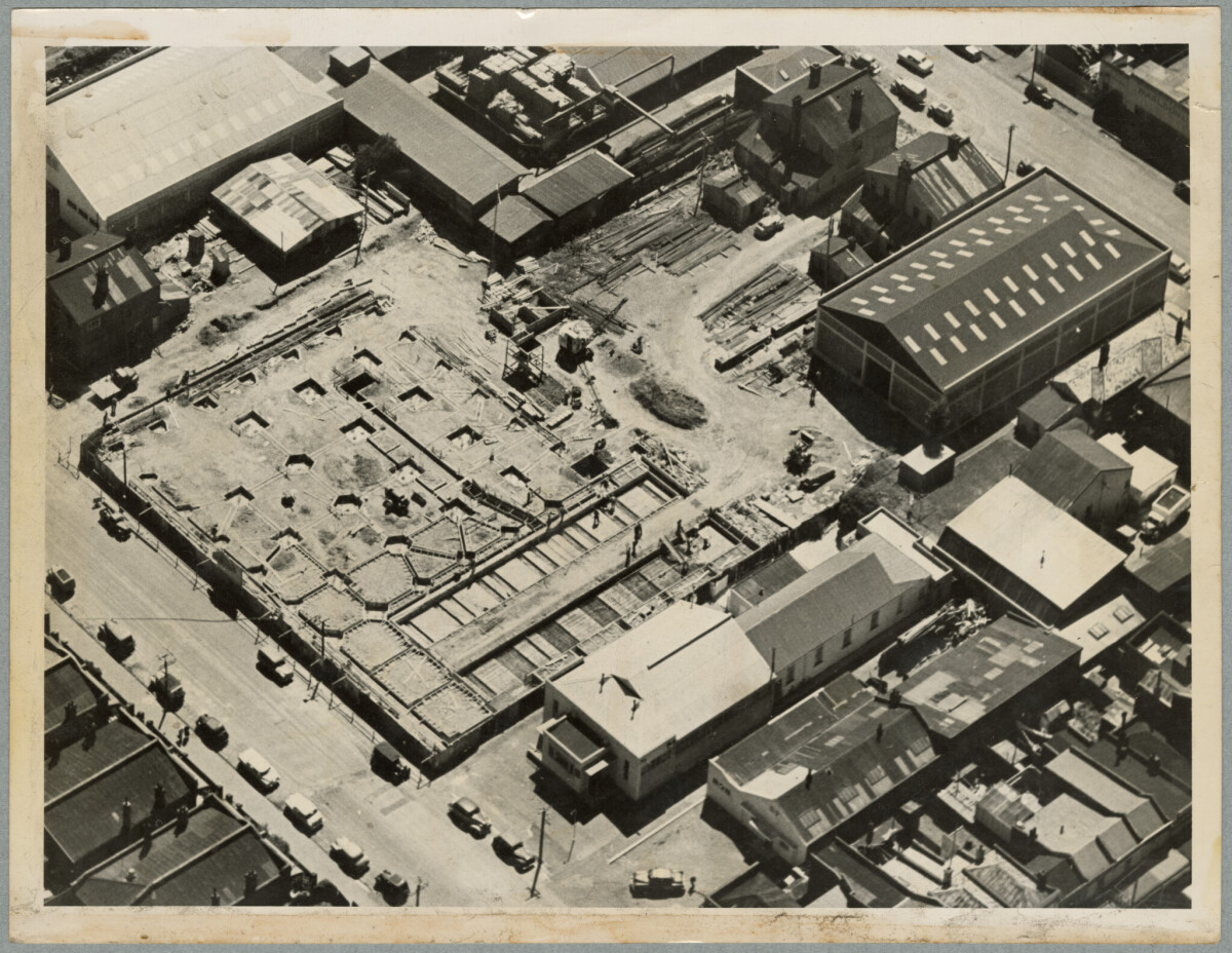 Aerial view of the construction site of the Christchurch Star office building on Kilmore Street.