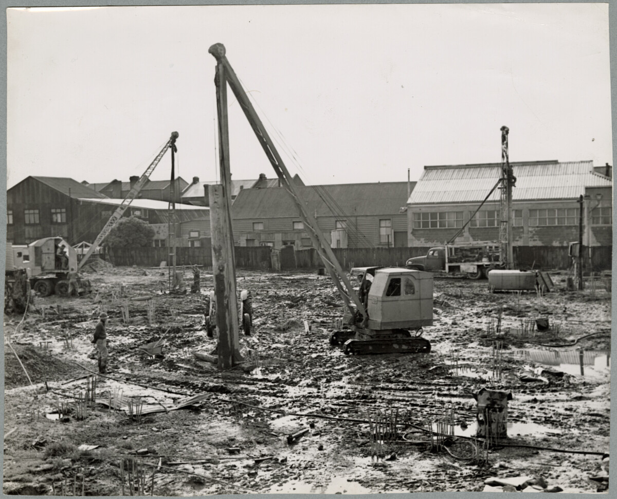 Foundations piles being driven at the construction of the Christchurch Star office building on Kilmore Street.
