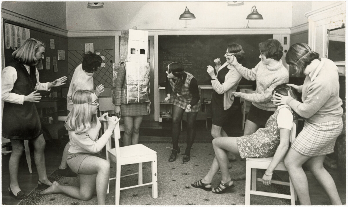 Lecturer at Christchurch Teachers College, J. Harvest (left), joining a drama performance with second year kindergarten student teachers.