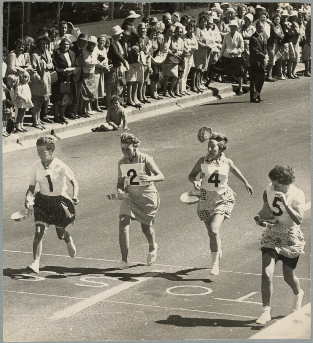 M. Hodgekinson, Y. Smith, M. Turnbull and F. Holland in the Shrove Tuesday pancake race at New Brighton.