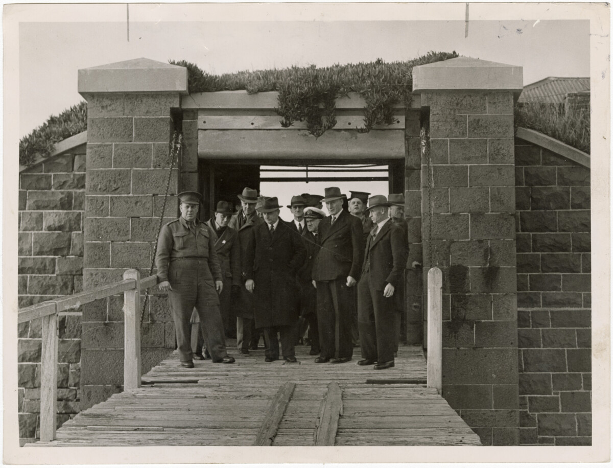 A group of officials on the drawbridge to Fort Jervois on Ripapa Island just off the Banks Peninsula near Diamond Harbour.