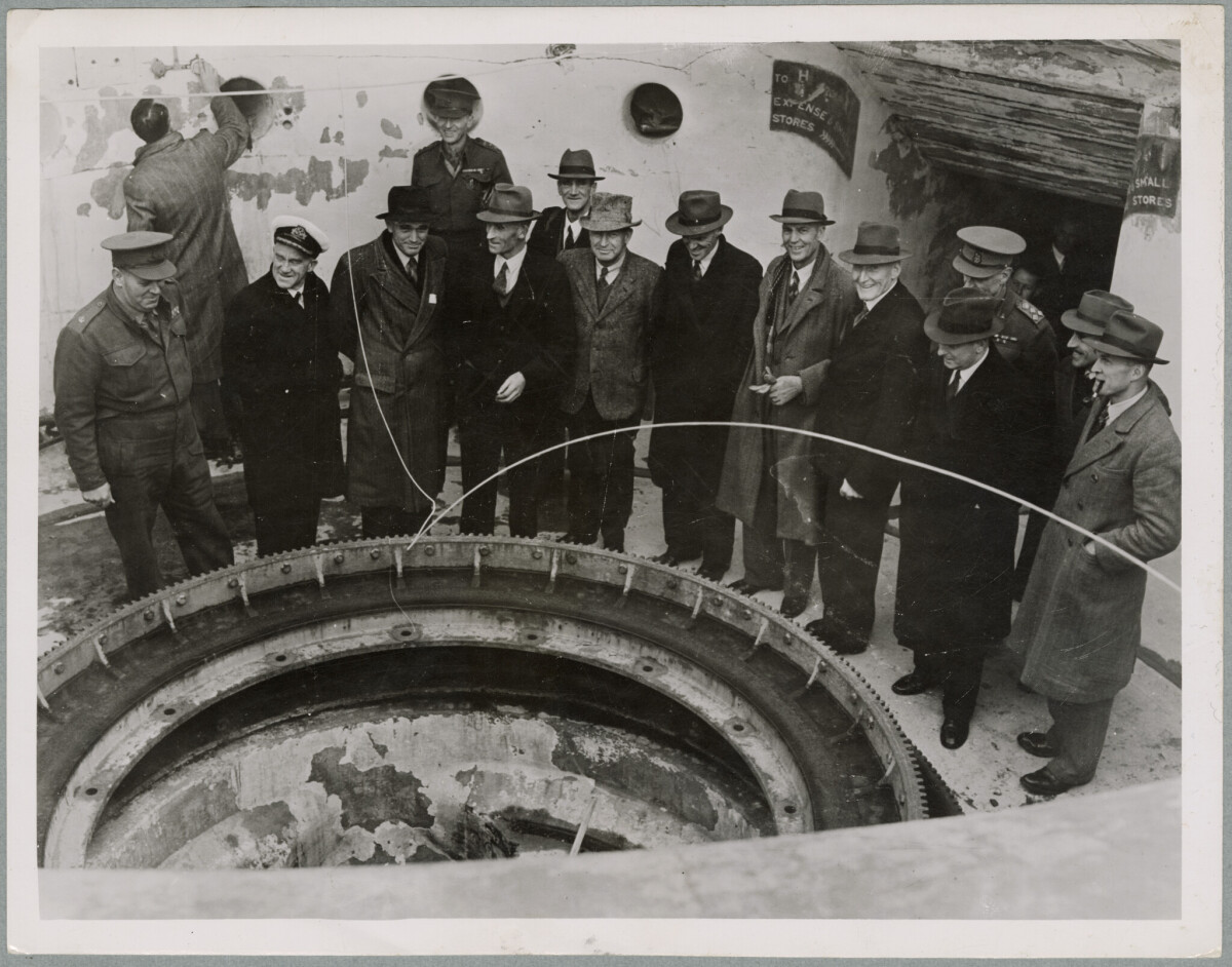 A group of officials inspecting a gun pit at Fort Jervois on Ripapa Island just off the Banks Peninsula near Diamond Harbour.