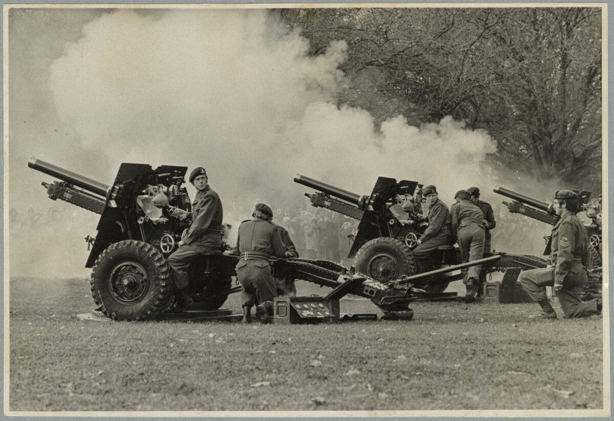 View of a 21 gun salute at Hagley Park in front of a crowd for the Queen's Birthday celebrations.