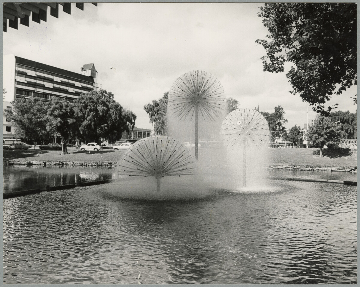 The Ferrier Fountain in Victoria Square looking across the Avon River towards Colombo Street and the Vacation Hotel.