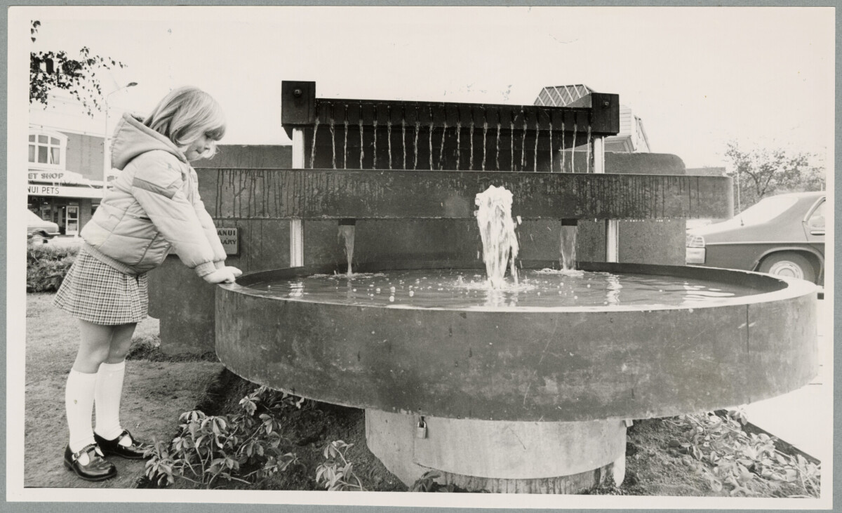 Catherine Johnson, 5, examines the fountain at the Papanui roundabout on Main North Road. The fountain was installed by the Papanui Rotary Club.