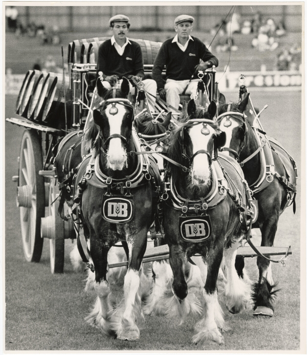 Nick van der Sande and Kim Clotworthy drive a team of six clydesdales at the Canterbury Agricultural and Pastoral Show.