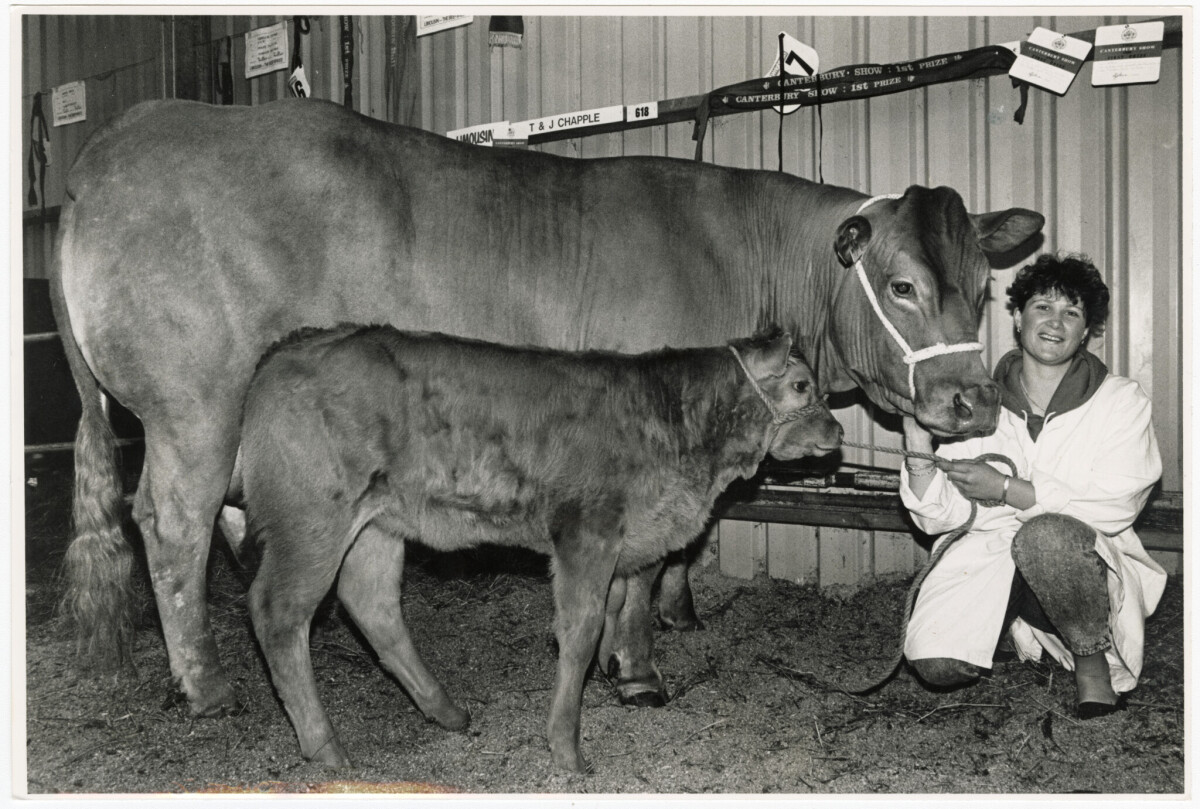 Leanne Chappell and prize winning limousin, Mitchfield Sally, with one of her four calves at the Canterbury Agricultural and Pastoral Show.
