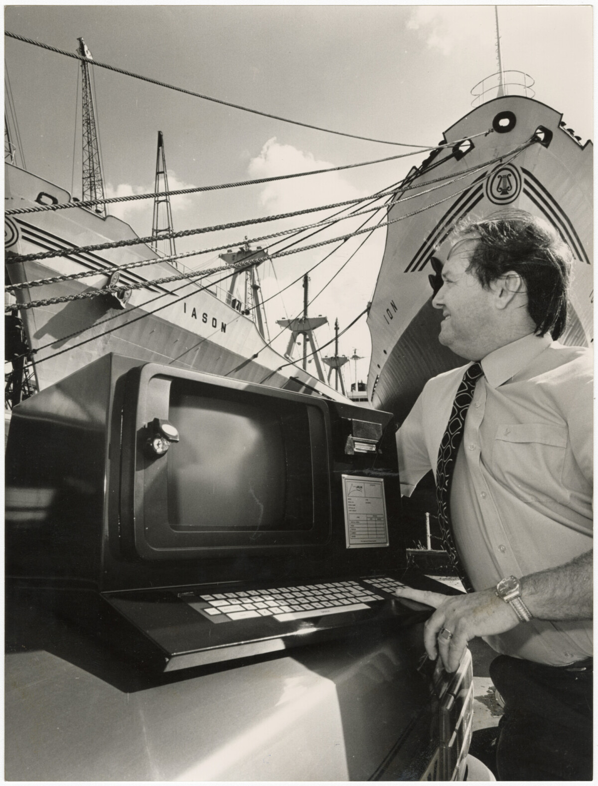 Marlin, a marine loading indicator computer in operation amongst cargo ships at Lyttelton Harbour. The computer is designed to help the loading and unloading of cargo including the weight of cargo and percentage loaded.