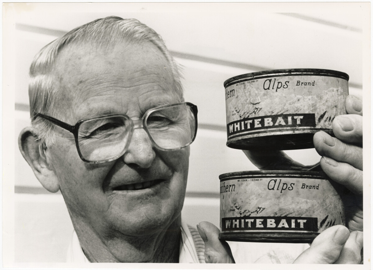 Bill Nolan with cans of Southern Alps Whitebait caught in the South Westland river.