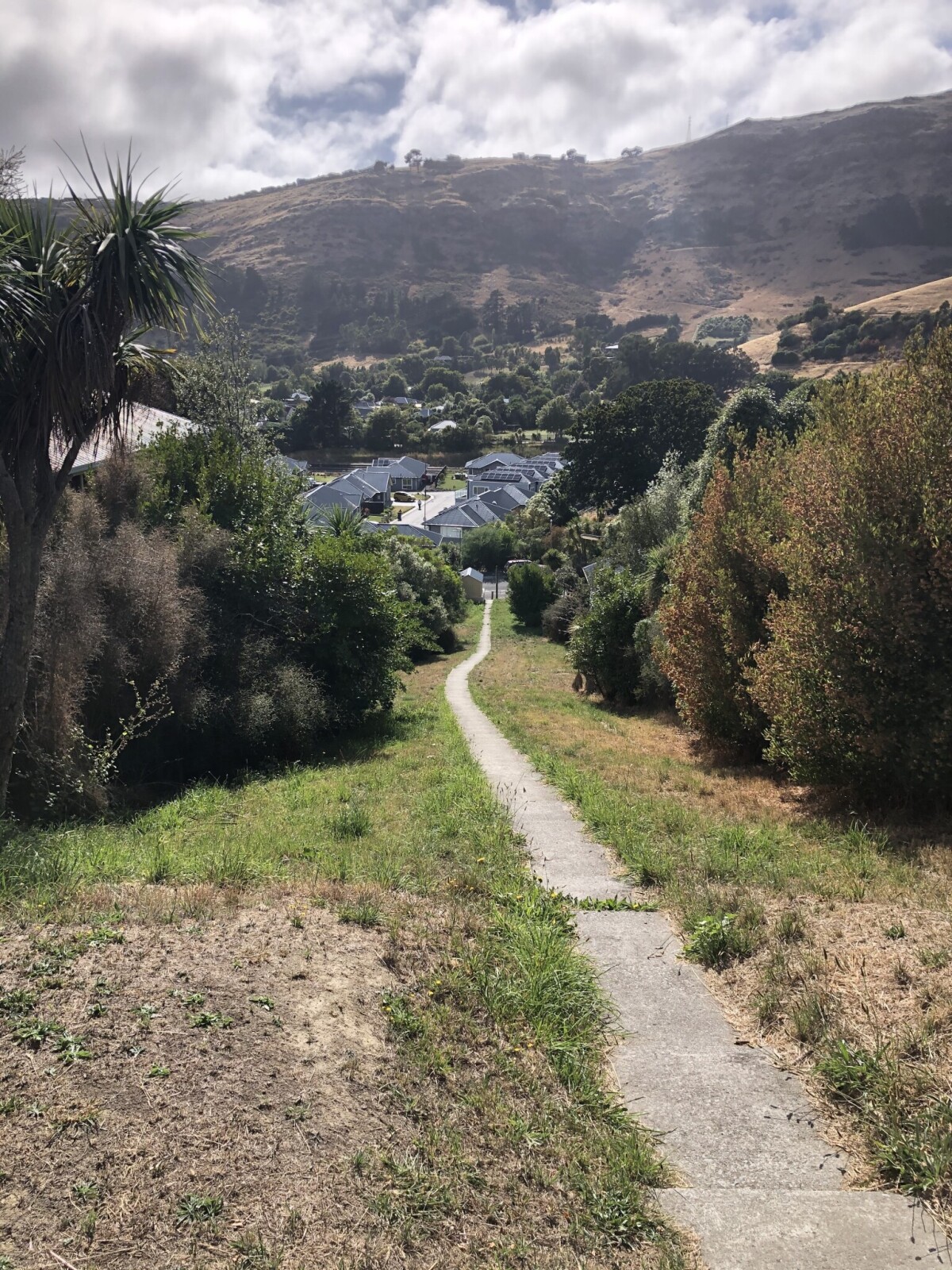 Looking down Ellis Track from Flinders Road towards the Maltworks Villas in Heathcote Valley