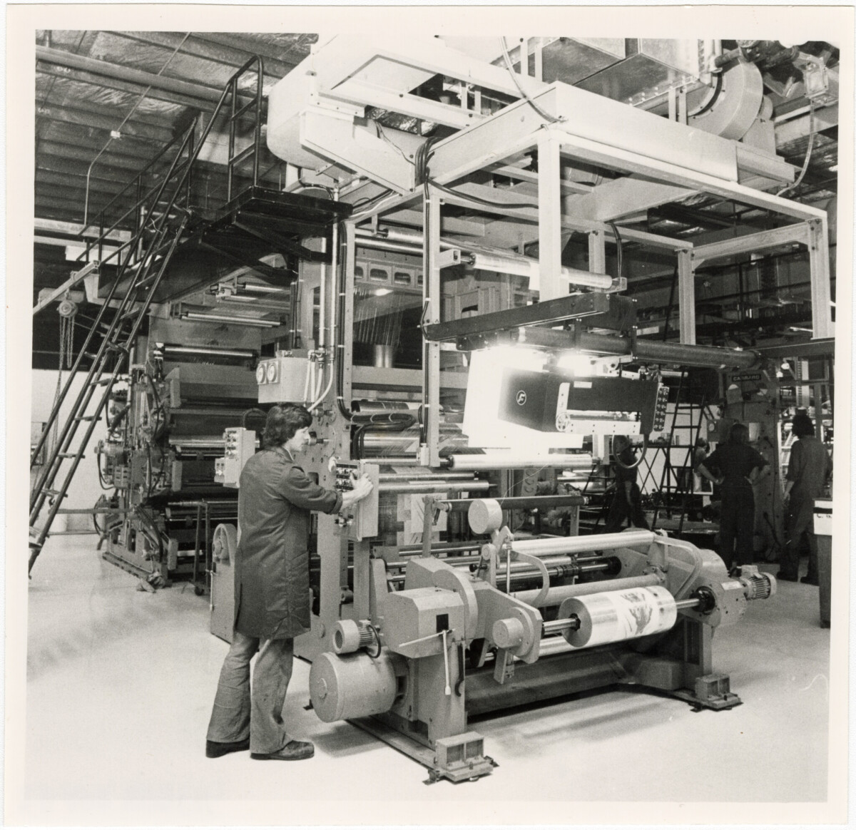 Adjustments being made to the six colour printing press at the Whitcoulls packaging plant in Hornby.