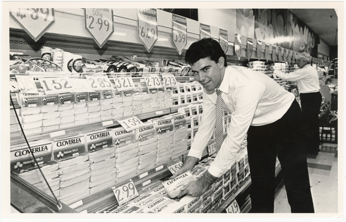 Sydenham Superbarn supermarket manager, Tom Dear, with a display of Cloverlea cheese products.
