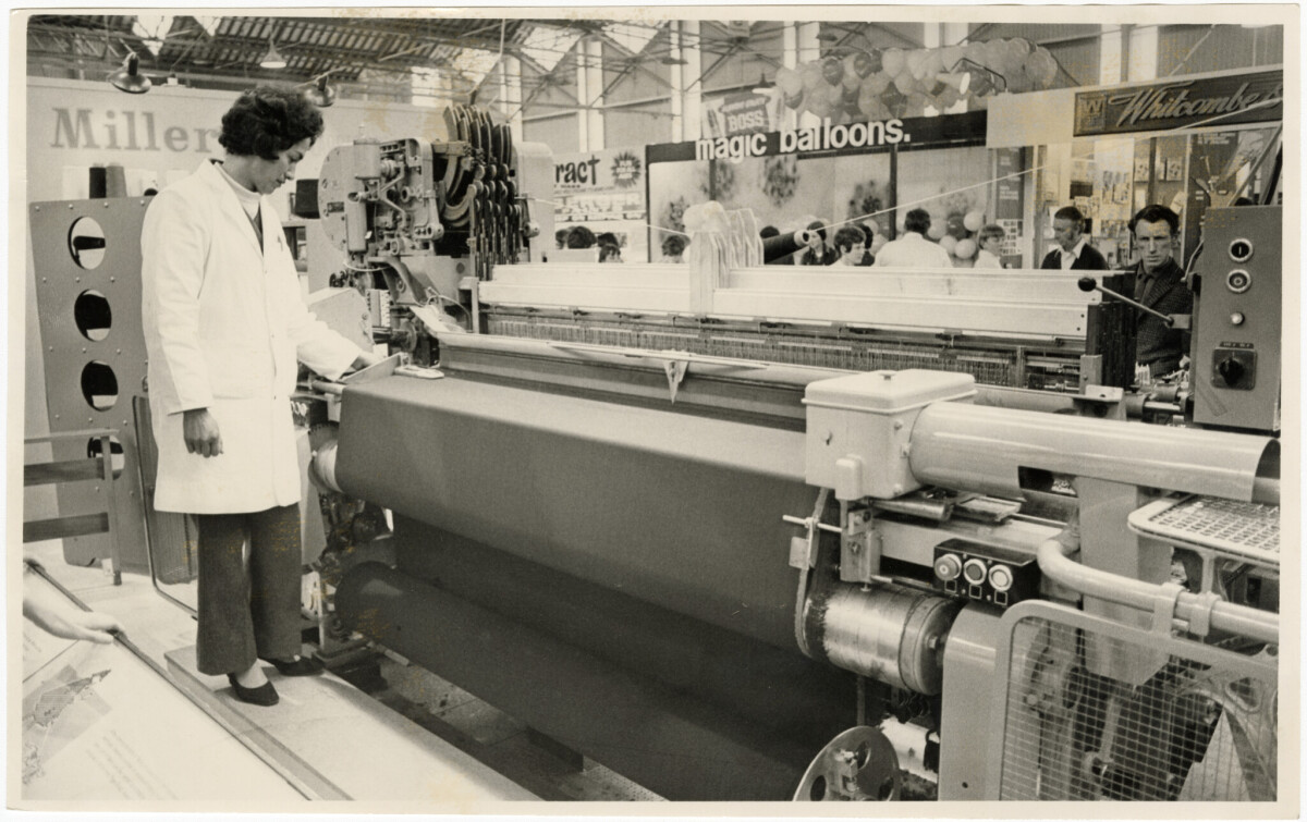 E. Carlton operates an automatic loom at the Millers Limited exhibition at the Industries Fair in Canterbury Court, Addington Show Grounds.